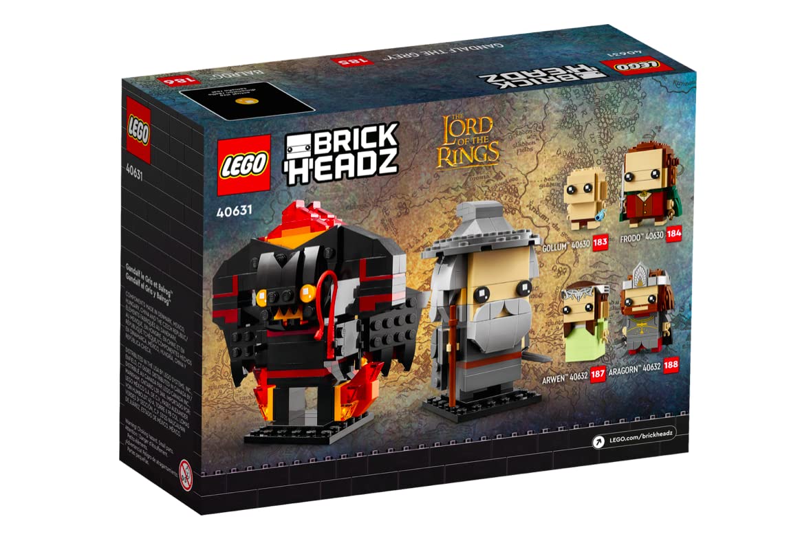„LEGO® BrickHeadz™“ Gendalfo Pilkojo ir Balrogo konstravimo rinkinys (40631). Rinkinyje yra „LEGO BrickHeadz“ Gendalfo figūrėlė su kardu ir lazda ir Balrogo figūrėlė su botagu